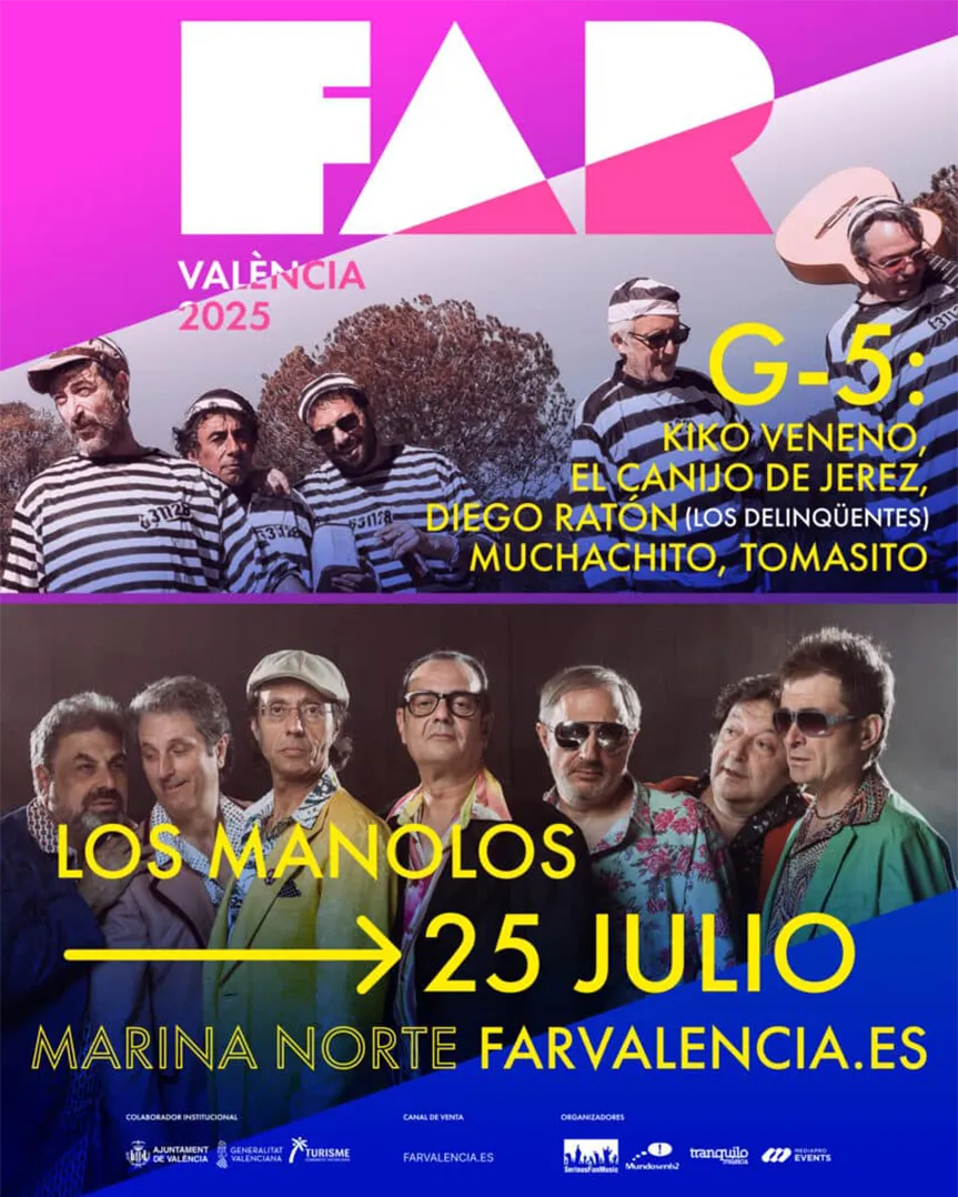 - G5 y Los Manolos (25 julio): noche festiva junto a Kiko Veneno, Tomasito, El Canijo, Muchachito y Ratón.