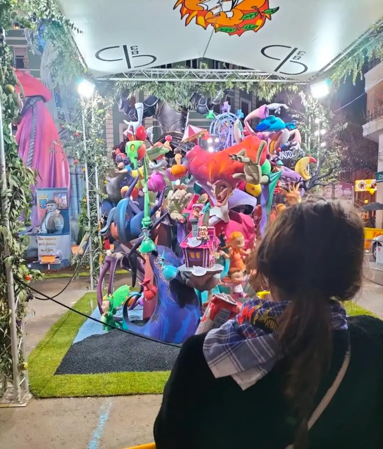 Se escuchan bandas por la calle, gente bailando alrededor. Decoración de luces. Puestos de churros con chocolate y obras de arte en cada calle llamados els Ninots.